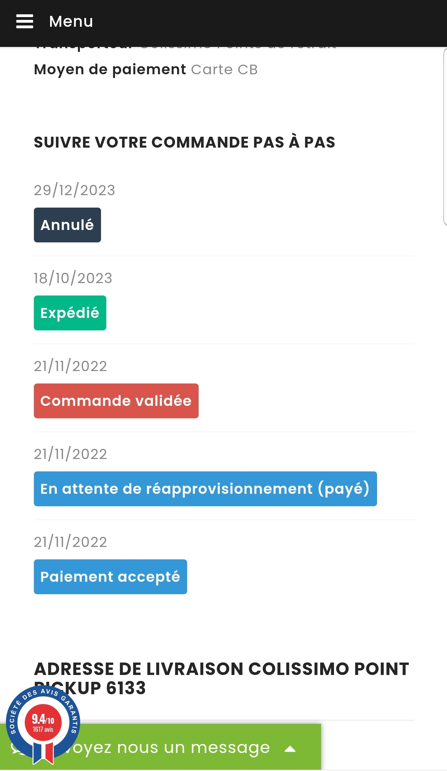 J'annule ma commande par téléphone, le jour d'après, pour cause d'erreur de ma part. La société me rembourse, impeccable!!