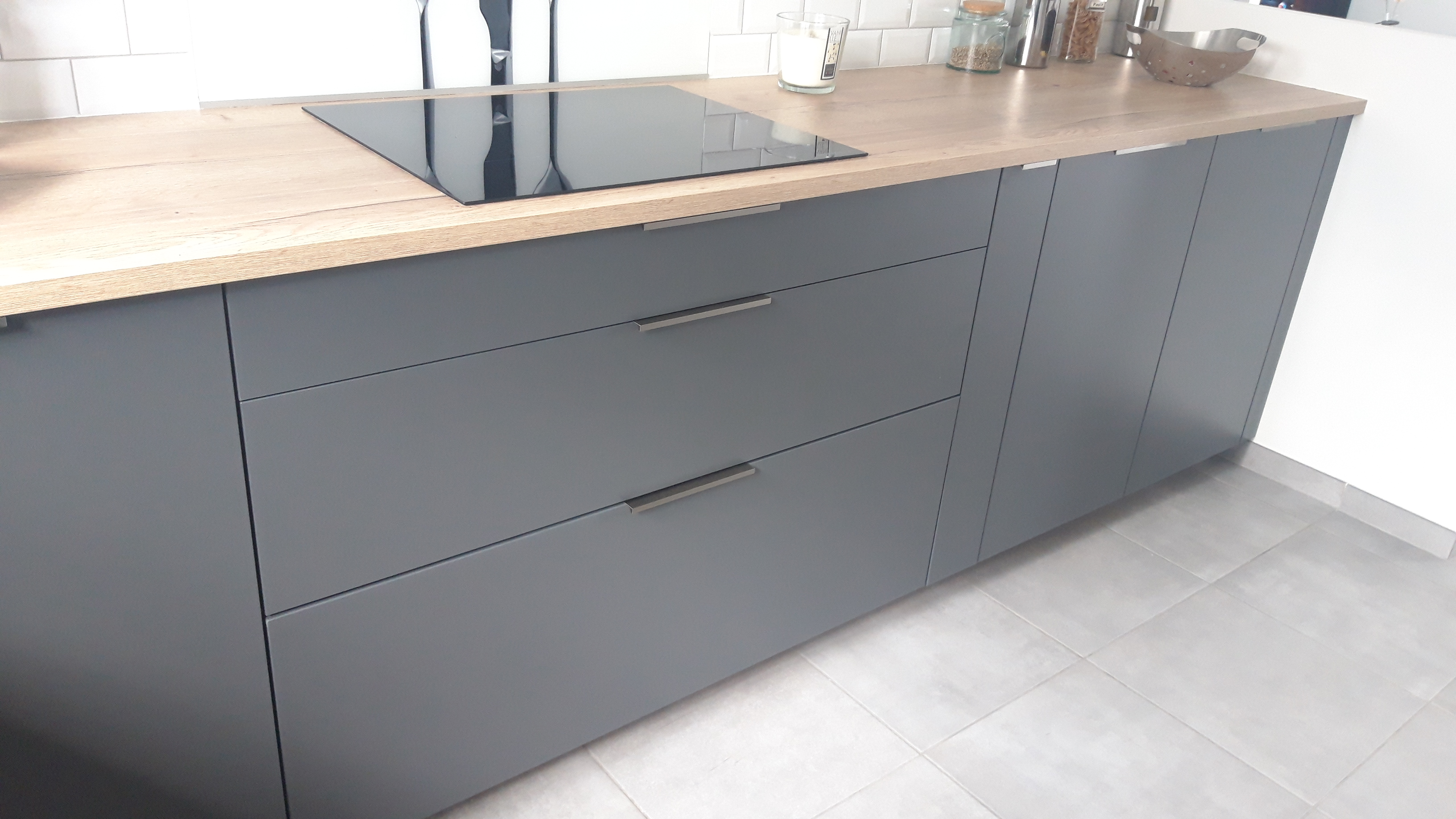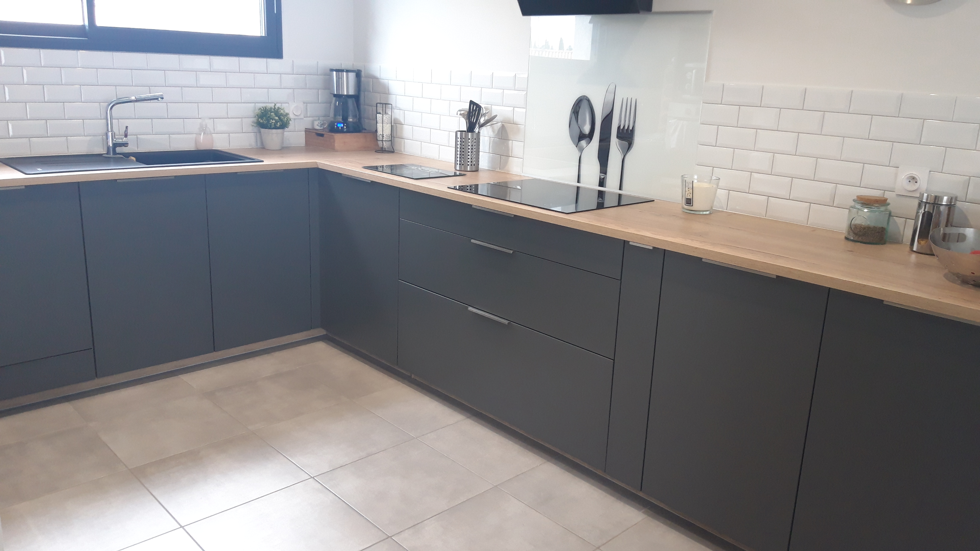 Je recherchais une cuisine avec des caissons bas plus hauts par rapport aux standards. Mon plan de travail devait être posé à 99 cm de hauteur par rapport à notre grande taille, pour respecter l'ergonomie. C'est fait ! Le plan de travail en quartz est un vrai plaisir. Assorti à la couleur des façades, ma cuisine devient discrète. C'était mon souhait après que nous avions remplacé la partie haute du mur par une verrière donnant sur le salon. L'artisan qui a posé ma cuisine, mandaté par So Coo'c a effectué ses découpes au millimètre près. En effet, aucun mur n'est plan ou vertical. Le L sur-mesure formé par le quartz est impeccable. Je ne m'attendais pas à tant d'application. Et pourtant, bricoleuse, je suis particulièrement attentive à la minutie apportée aux détails. J'avais une idée et un plan précis en tête. À présent, ils sont bien réels, sous mes yeux. Quel plaisir de vivre dans cette cuisine.