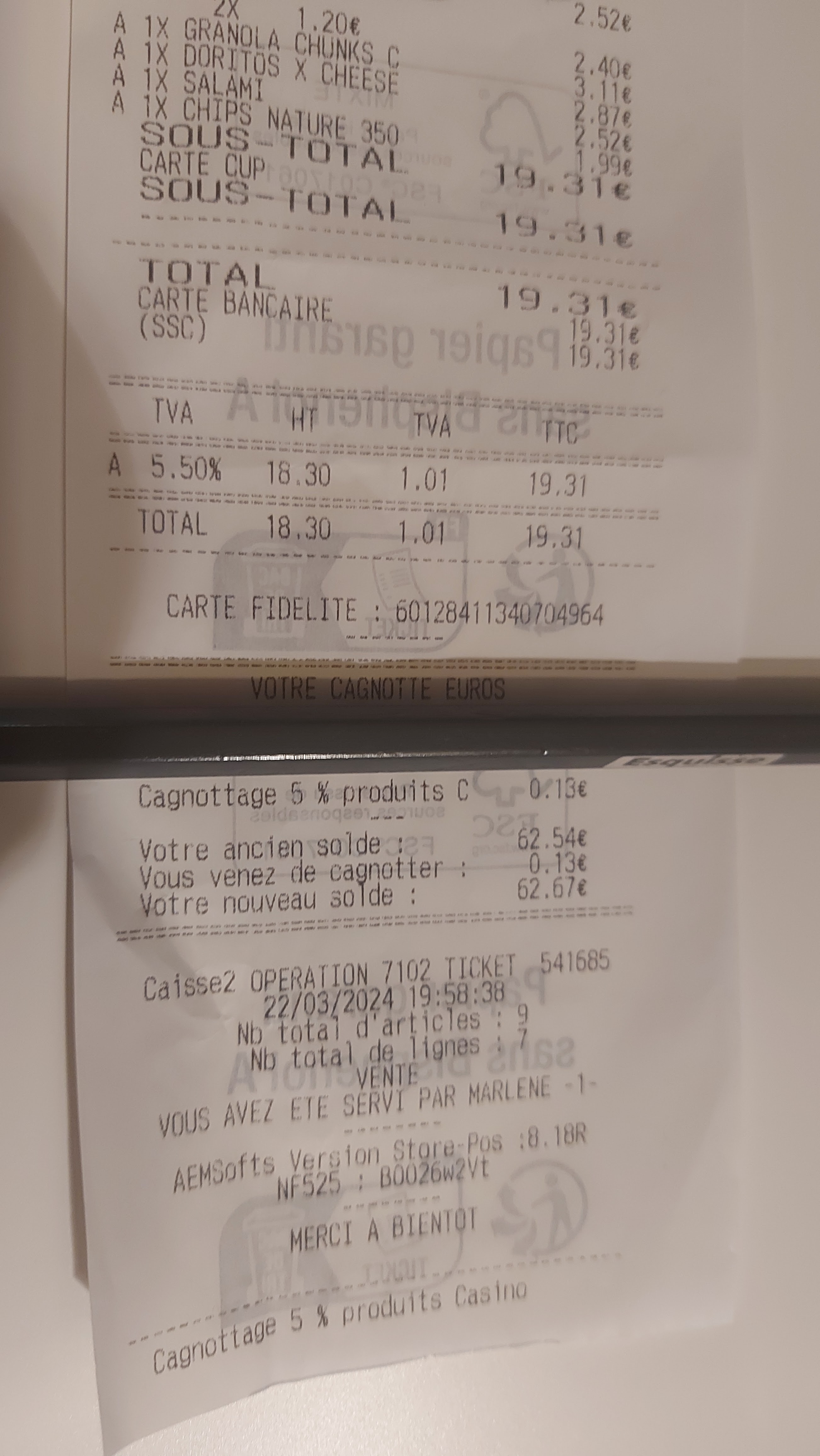 Bonjour, je suis un client trés regulier de votre magasin depuis déjà 8 ans. Je n'ai jamais eu de problèmes. Toujours très respectueux. Très bon service. Mais aujourd'hui à l'encaissement, un de vos caissier (vous avez l'heure exacte sur la photo) a utilisé SA propre carte de fidelité dans MA commande. A aucun moment, j'ai été prévenu. Il ne m'as pas proposé d'utiliser MA propre carte fidelité. Et bien sûr, ce n'est pas la première fois qu'il le fait, voyant sa cagnotte. Il le fait en cachette. Je me suis rendu compte directement. C'est pour cela que j'ai demandé le ticket détaillé. Je laisse ce message surtout pour les propriétaires. C'est très mal honnête de sa part et très décevant. Les propriétaires ne méritent pas ça. Vous pouvez me contacter si jamais. Bonne soirée. (J'ai caché le nom sur la photo)