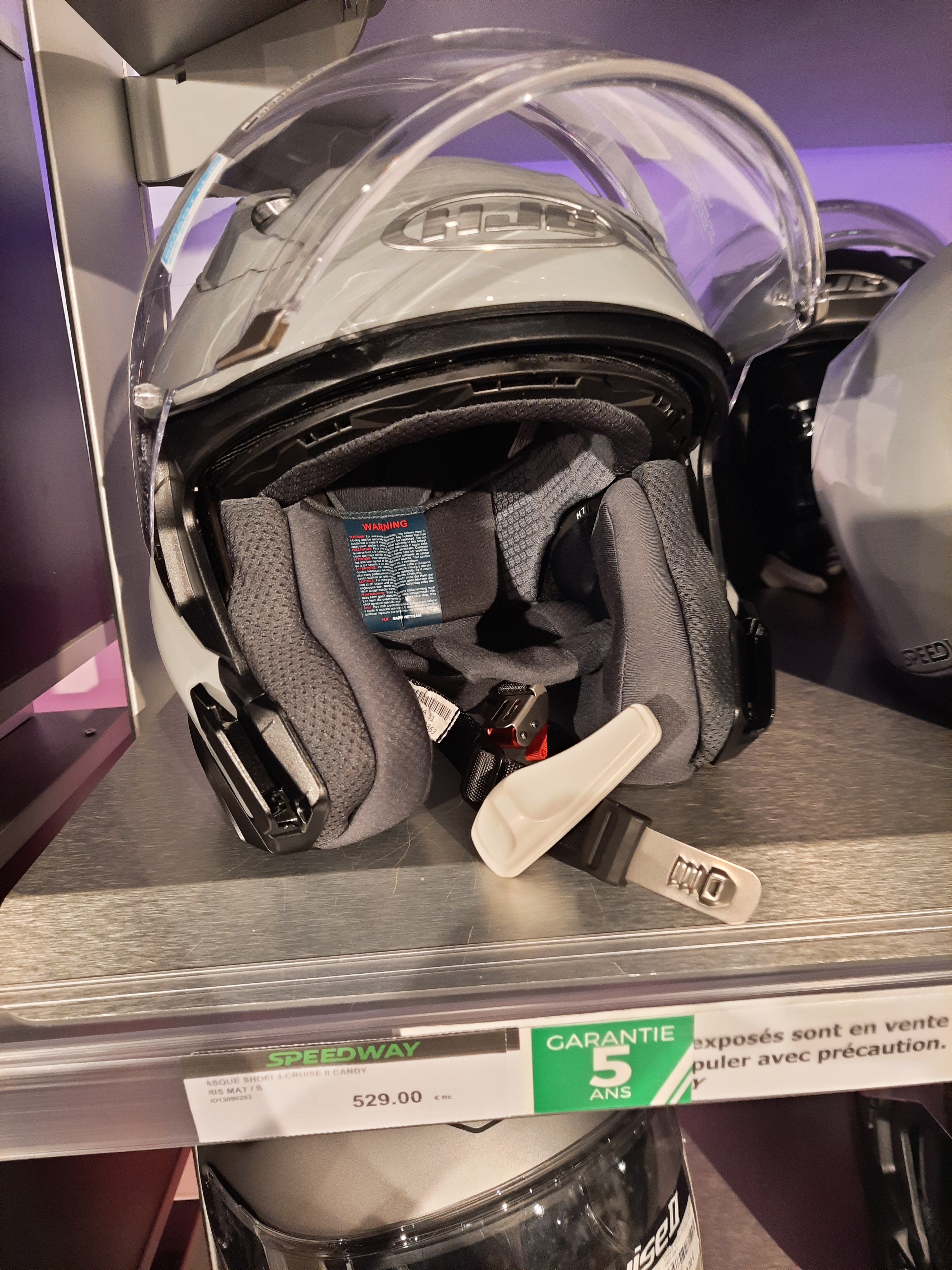 Speedway paris, Très mauvais plan. Le 15 mars 2024 je suis reçu par le jeune vendeur a la moustache et barbe rousse, je lui demande de m'aider a choisir un casque modulable dans la fourchette de 100 à 150 euros et je lui indique bien mon tour de tête 58 cm , il me répond oui c'est équivalent a la taille L et il me propose un casque speedway (kokpit) je l'essaie , je demande au vendeur si la taille est bonne (je ne suis pas connaisseur) il le bouge en avant en arrière sans même fermer la sangle et me dit c bon c la bonne taille.je lui fait totalement confiance ,je lui demande un film anti buée il me répond qu'il est en rupture de Stock . En rentrant a ma grande surprise je découvre que : 1/ la taille du casque n'est pas la bonne XL 61-62 au lieu de 58 2/le film pinlock est normalement fourni avec le casque (c'est écrit sur la visière) 3/lors de la démonstration l'écran solaire s'est bloqué le vendeur l'a débloquer me je rend compte après que c'est un défaut. 4/ pas d'autocollants réfléchissant 5/ aucun conseil sur l'entretien (lavage) 6/ le pire de tous c'est la mauvaise foi du vendeur qui essaie de fourguer n'importe quoi pourvu qu'il fasse une vente, malgré que j'ai choisi votre marque. Conclusion : Vendeur malhonnête Produits mauvaise qualité Pour 120 euros j' aurai pu avoir mieux chez Dafy moto. A bon entendeur salut