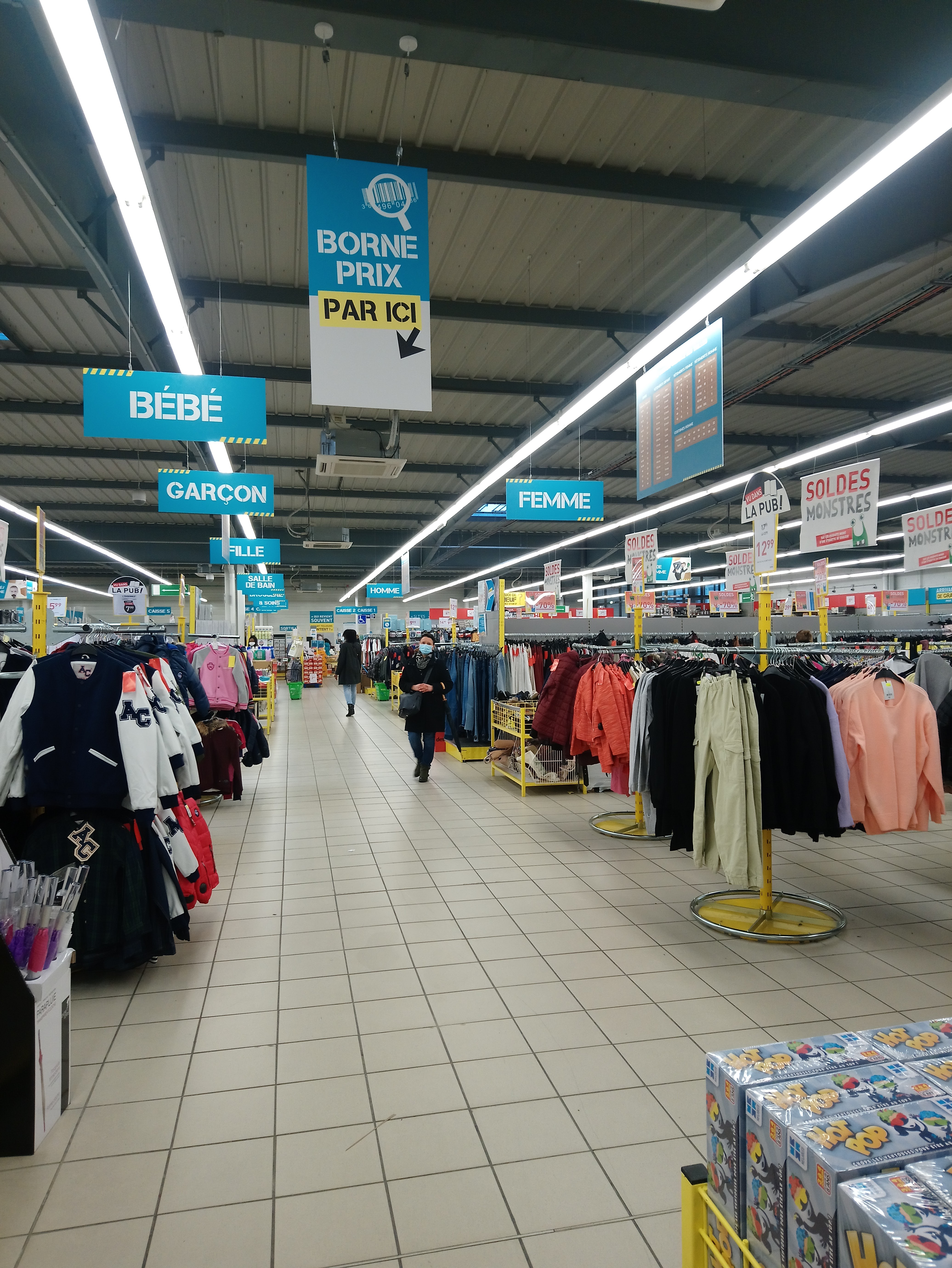 Prix intéressant. Beaucoup de choix mais pas dans les grandes tailles. Et autant c est bien rangé pour les hommes et enfants autant c est le foutoir chez chez femme qui ont un petit espace toute proportion gardée