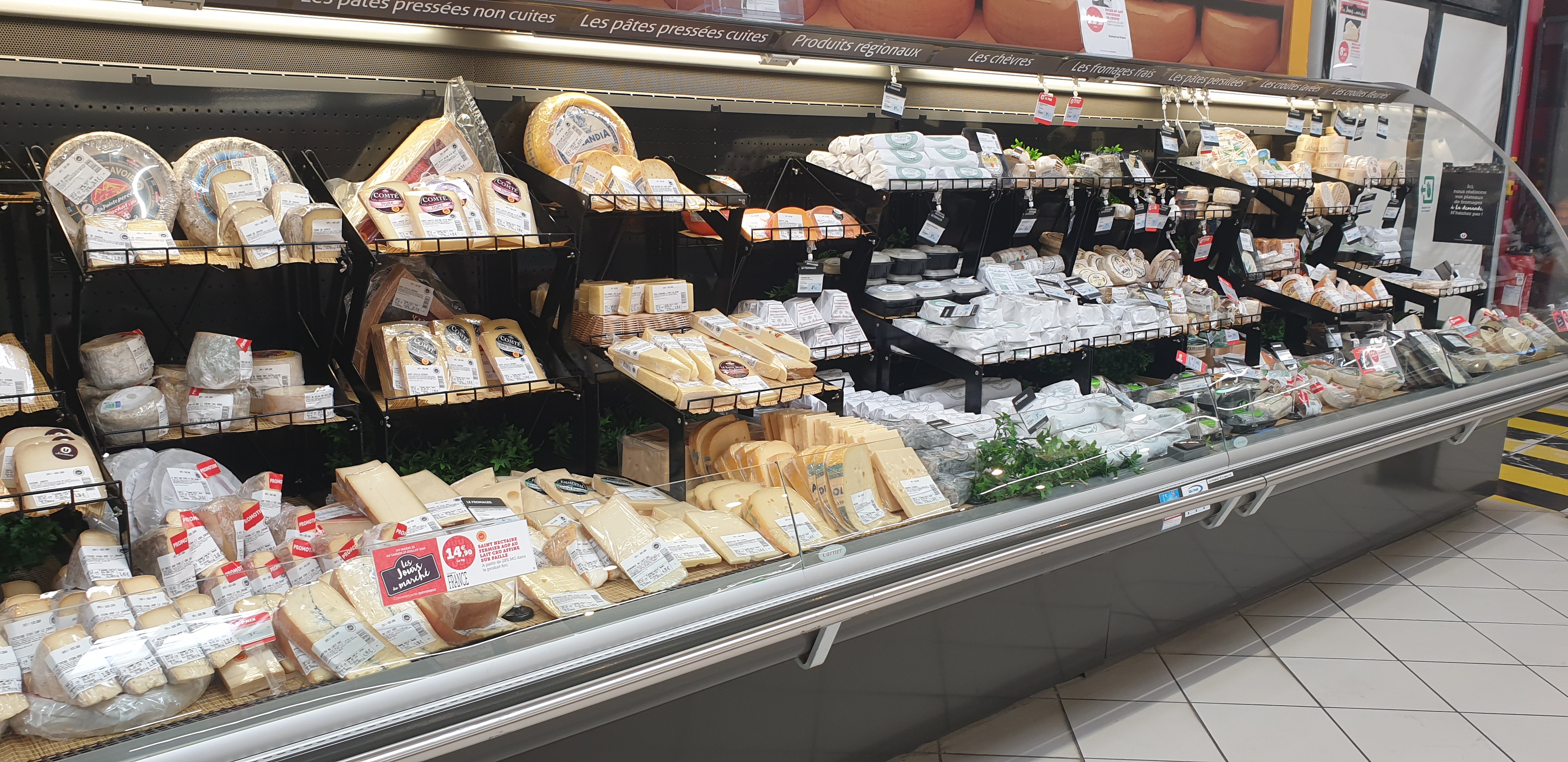 Grand supermarché avec large gamme de fromages, charcuteries notamment.