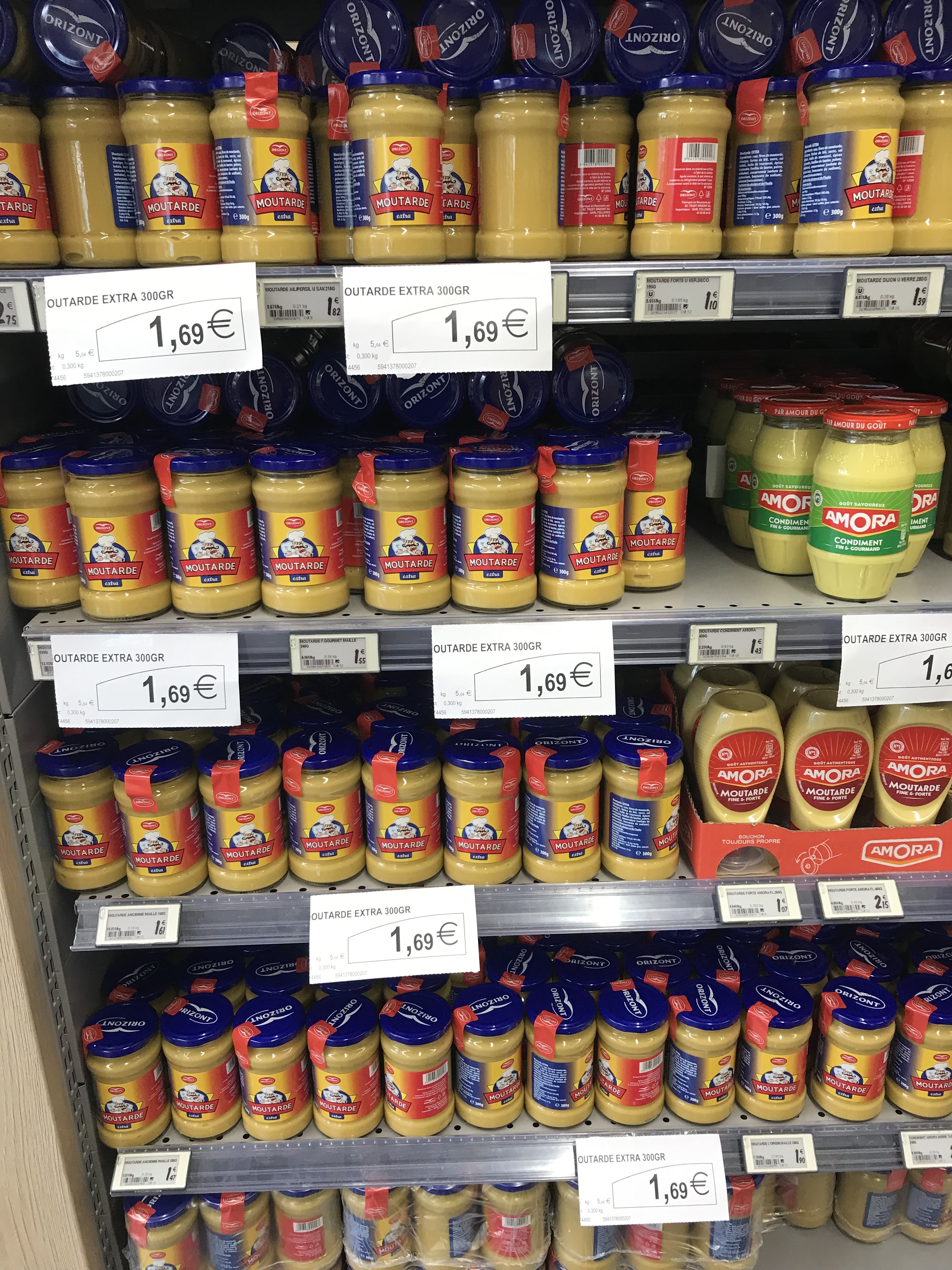 Bonjour, je fait pars de mon mécontentement suite à l’achat de cette fausse moutarde. Comme vous pouvez le voir ( photo) il n’y avait guère le choix que de prendre cette soit disante moutarde… j’aurais mieux fait de ne pas l’acheter, à l’ouverture du pot elle puait le cornichon puis la couleur bizarre ne donne pas non plus envie de la manger. En plus en lisant l’étiquette je me suis aperçu qu’elle était fabriqué en roumanie. 🤣 enfin bref je déconseille cette moutarde. Merci