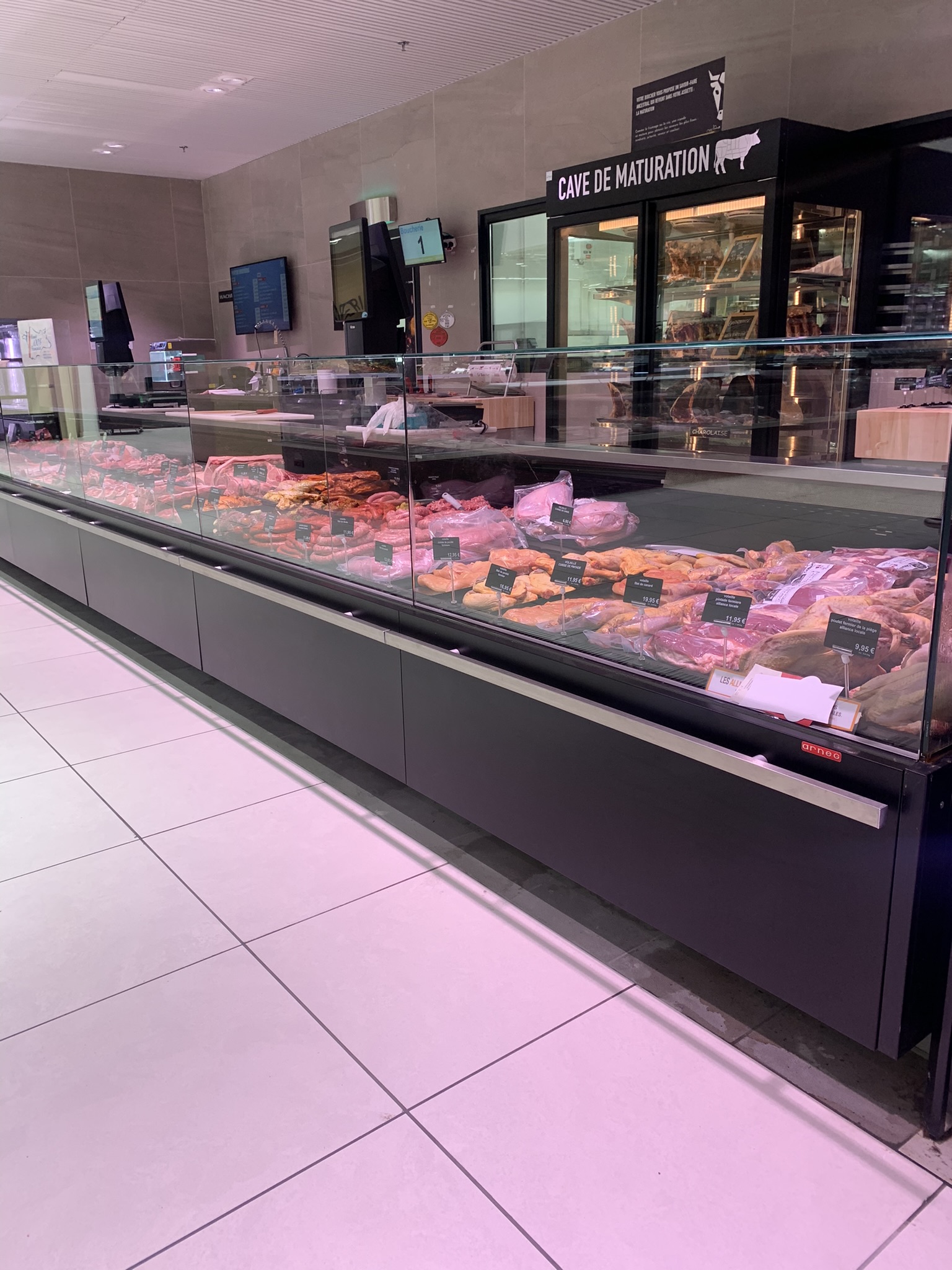 Propreté top dans tout le magasin. Boucherie , poissonnerie charcuterie, fromage très propre.pas de mouche sur les aliments contrairement à certains endroits, boucher et poissonnière de bons conseils.A très bientôt