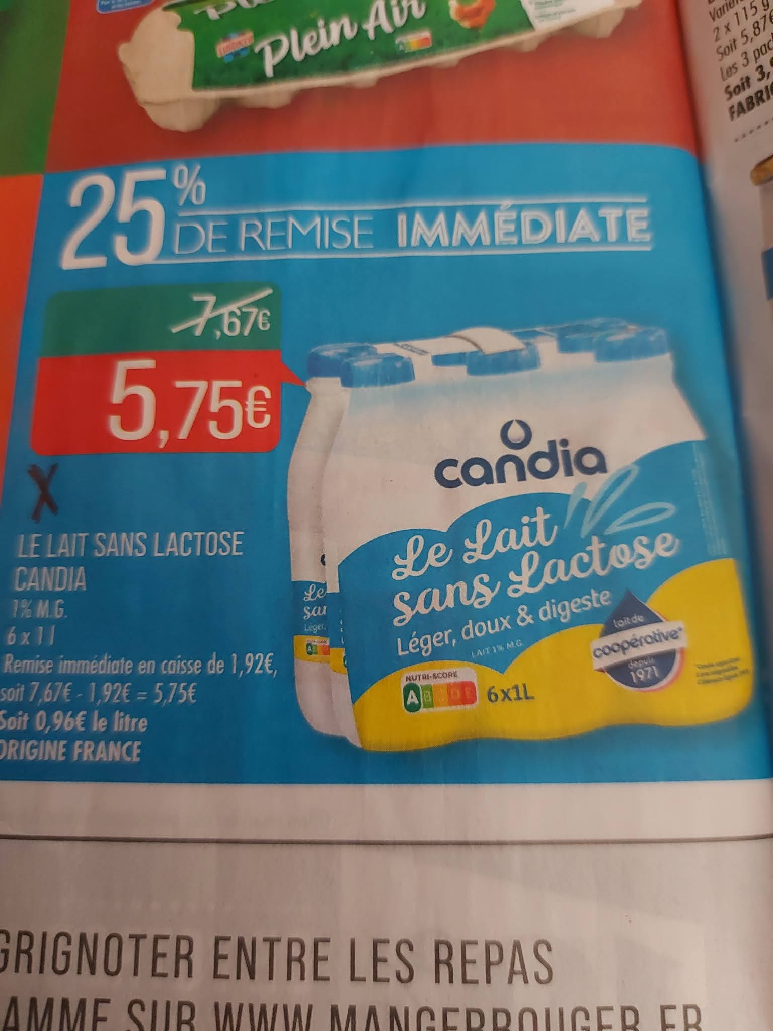 promo du 16 au 28/11 lait sans lactose candia 5,75 le pact de 6x1, et surprise il y en a pas, stock inexistant et il ne savent pas si ils vont en avoir meme pas sur palette seulement en rayon donc 6 pact pas plus , sérieux. Mais bon sa ne répond jamais quand c négative, toujours quand c positive et encore.Se n'est pas comme sa que l'ont garde des clients