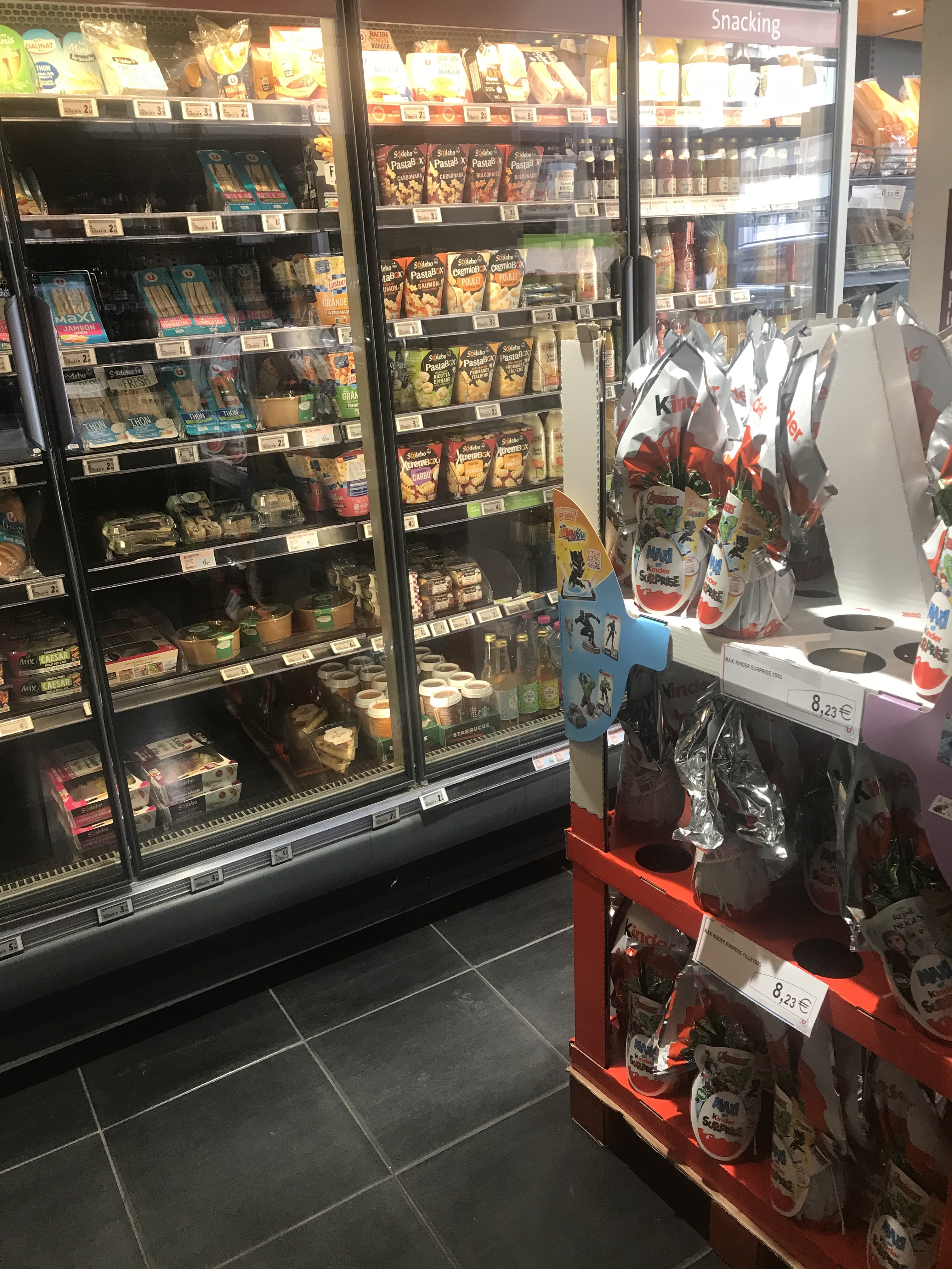 Magasin u express bien achalandé, les confiserie de chocolat sont regroupés avec les biscuits et tablette de chocolat. Kinder et Nutella en tête de gondole.