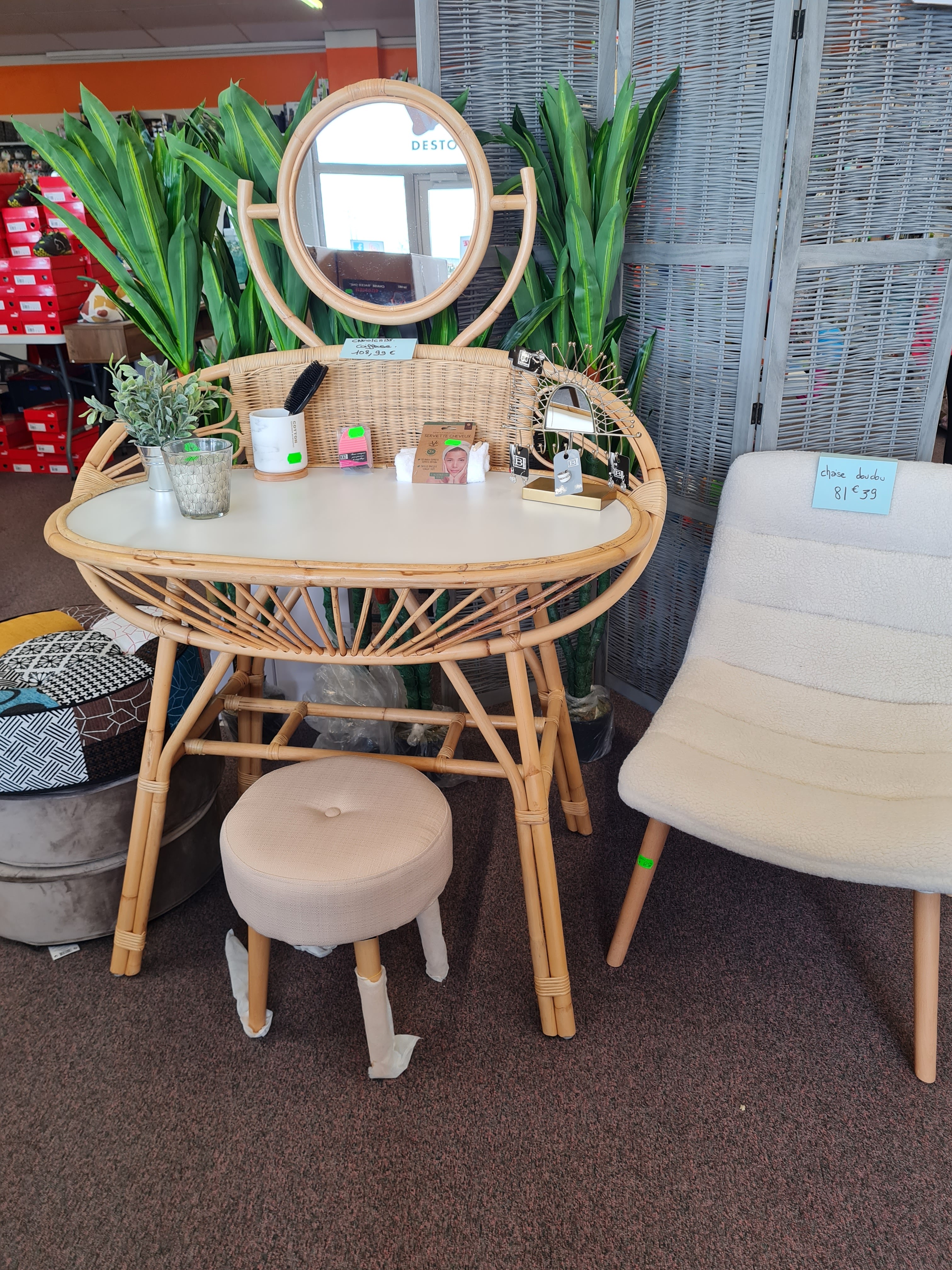 Vendeuse accueillante et à l'écoute. Elle a su très bien me conseiller. Les prix sont correcte mais reste assez cher pour du destockage. La vendeuse a bien fait son travail et à quand même réussi à me vendre de la déco.