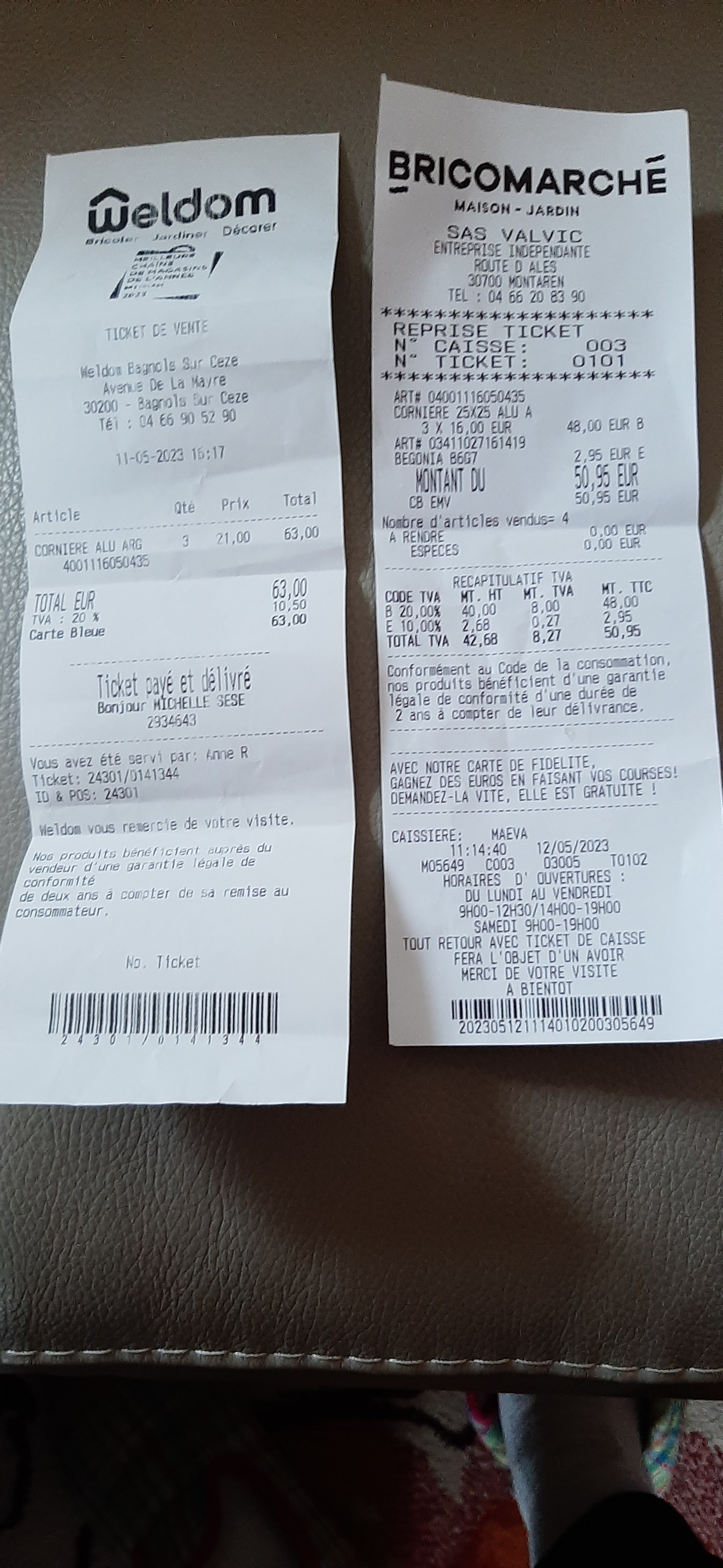 Tout simplement outrée par la différence de prix sur un même produit : cornières alu 25x25x15 - avec un code-barre identique : 4001116050435 Tenez-vous bien : Weldom bagnols : 21 € Bricomarche Uzès : 16 € On rembourse la différence ! J'ai les 2 tickets de caisse